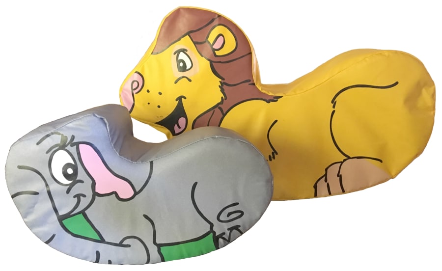 Jumbo the elephant is 20" long and 9" to the seat and the friendly lion measures 26" long and 12" to the seat, making them the perfect height for those little legs to reach the ground.