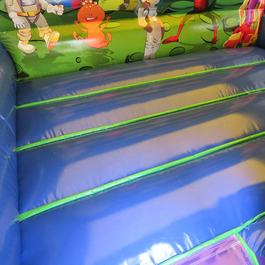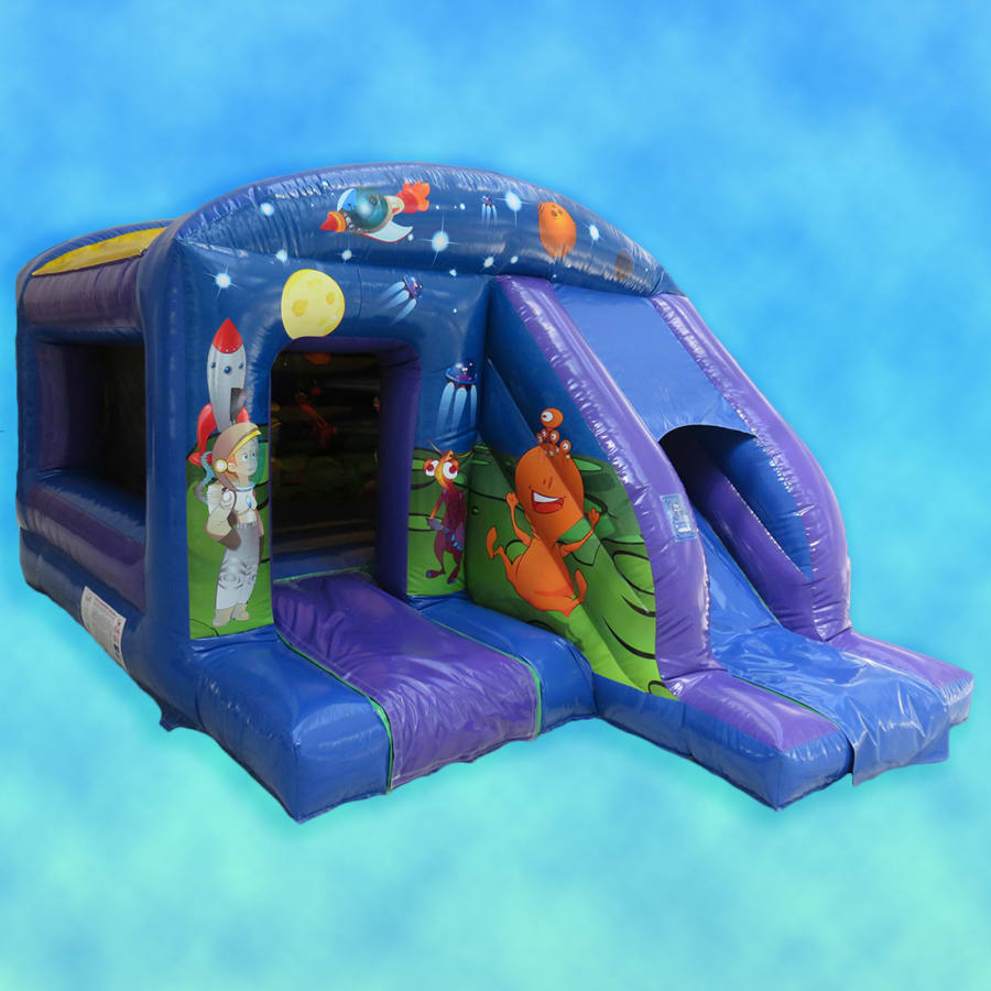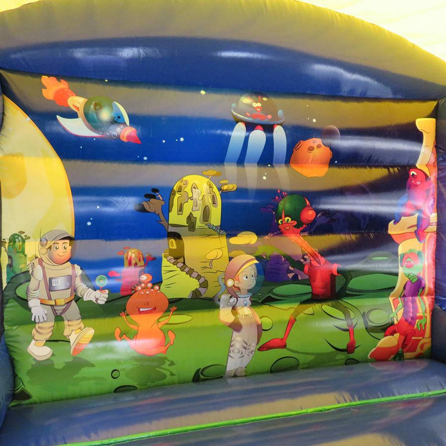 Another ever popular Bounce n Slide but this time with an out of this world Space Alien theme. Let your galactic adventurers bounce amonst the planets and stars then ride the slide back to terra firma. The artwork on this inflatable is absolutely stunning and the sides are netted giving maximum visibility into the castle, thus ensuring supervision is a breeze!