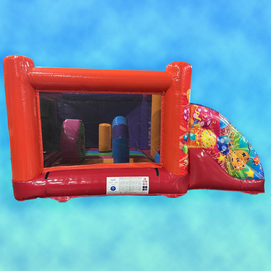 This bright and colourful castle with it's cheery balloon design provides ample bouncing space but also has pop up's, biff and bash activities inside and a slide on the front to complete the fun. The all around netted sides ensure that the children can be easily watched whilst having fun.